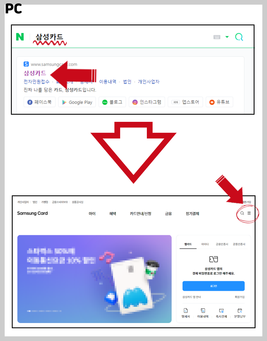 PC : 검색창에 '삼성카드'를 검색하시어 홈페이지에 입장합니다.