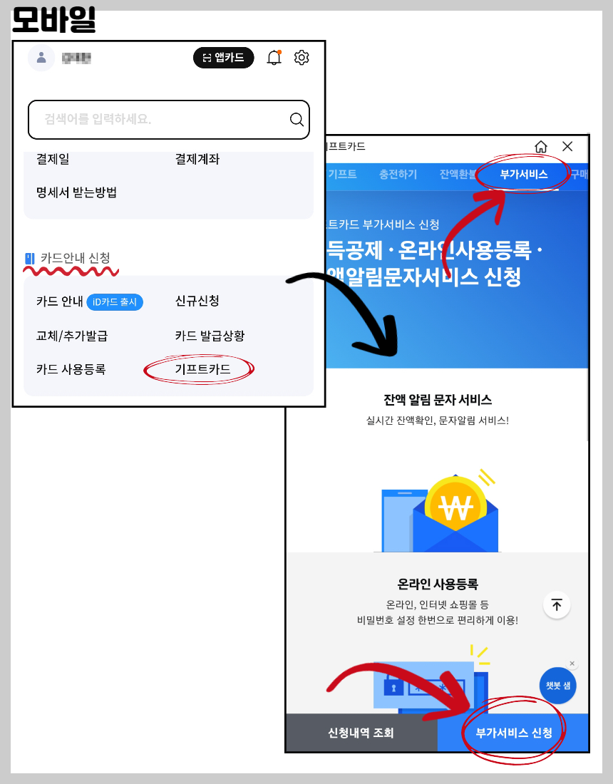 - 카드안내신청 → 기프트카드 → 부가서비스 이동