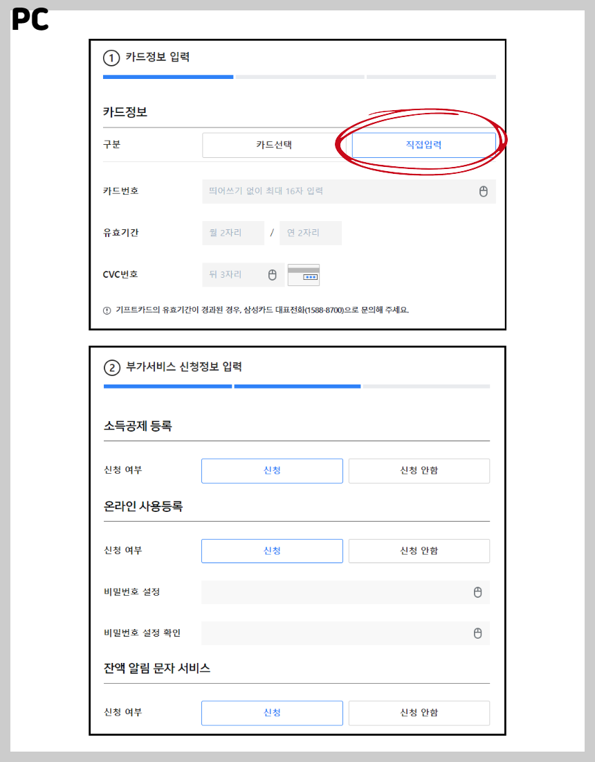PC / 모바일: 화면 아래 부분에 '부가서비스 신청'을 통해 카드 정보 입력 사항으로 입장합니다. 이후 기프트 카드 정보를 입력하여 줍니다. (처음에 로그인을 하지 않았다면 이 부분에서 로그인을 합니다.)