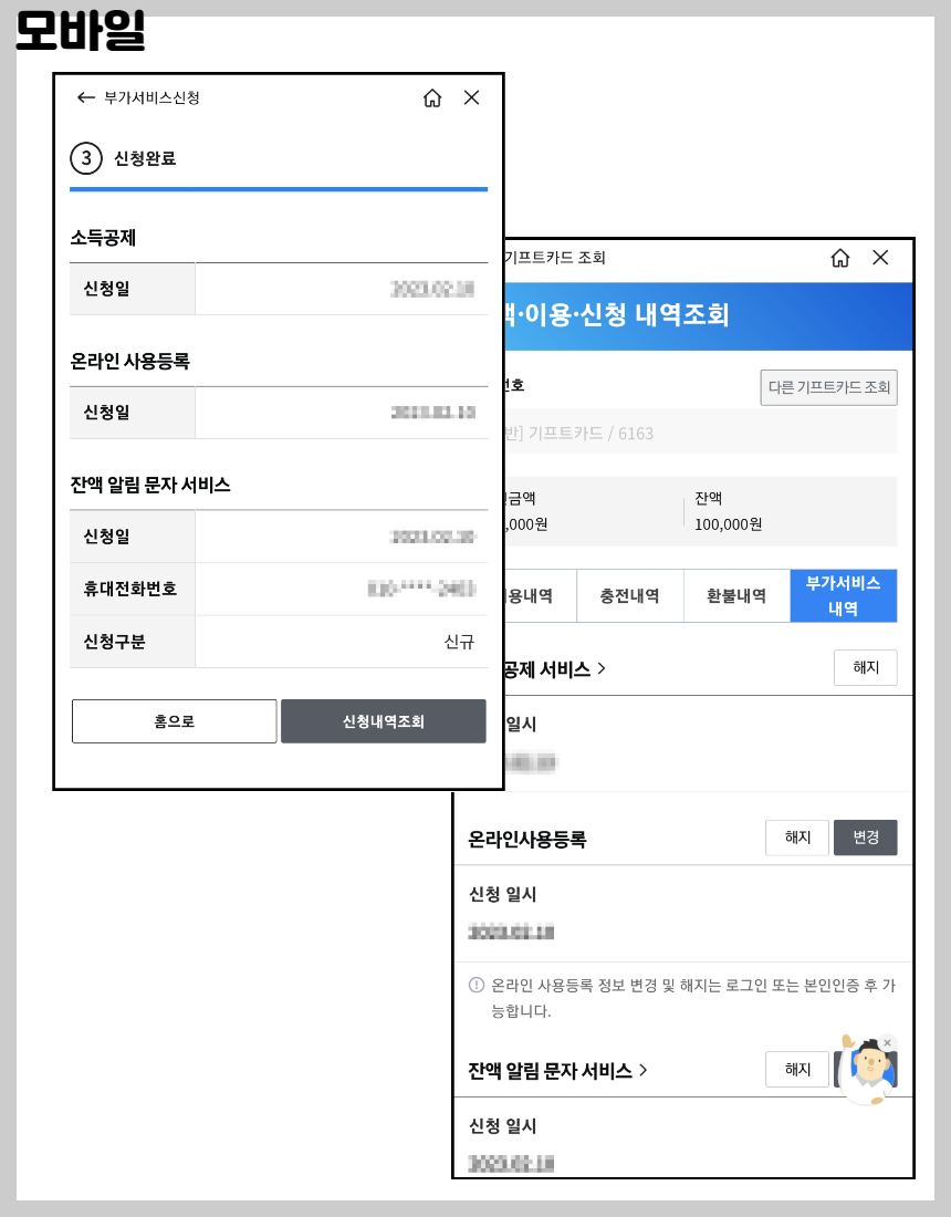- 카드안내신청 → 기프트카드 → 부가서비스 이동
