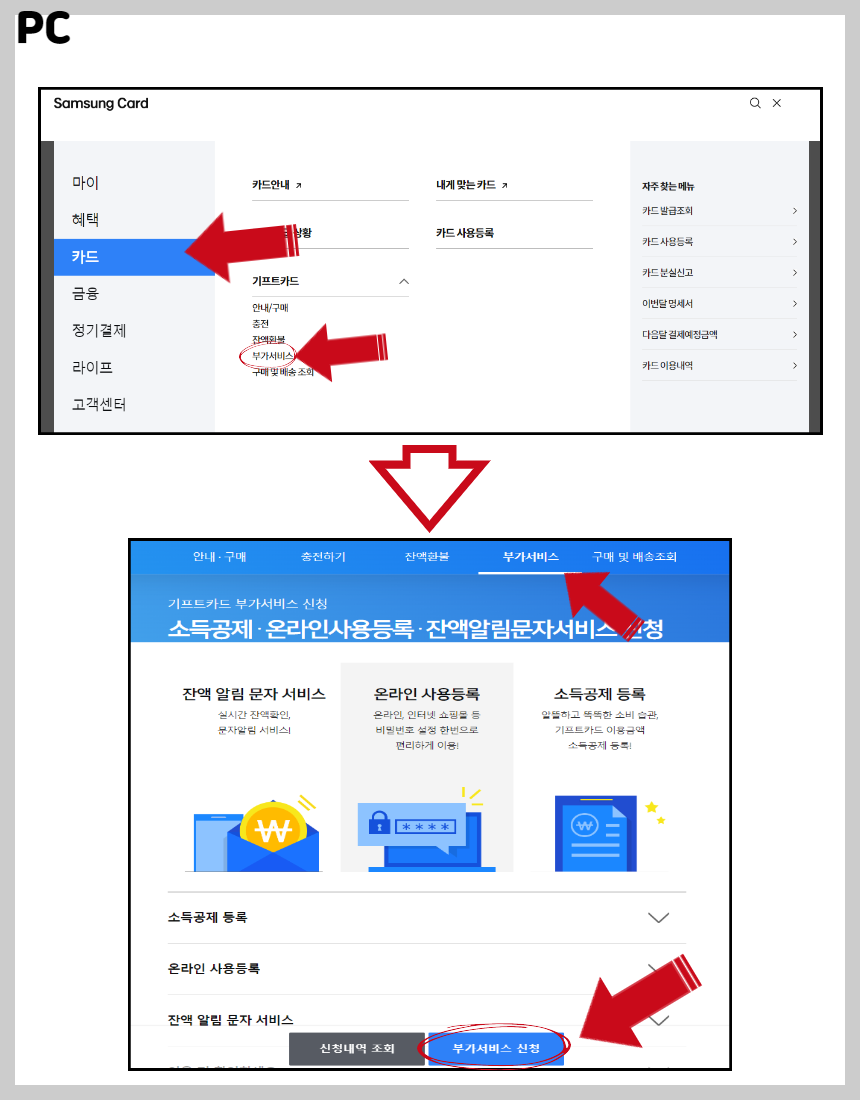 PC / 모바일: 화면 아래 부분에 '부가서비스 신청'을 통해 카드 정보 입력 사항으로 입장합니다. 이후 기프트 카드 정보를 입력하여 줍니다. (처음에 로그인을 하지 않았다면 이 부분에서 로그인을 합니다.)
